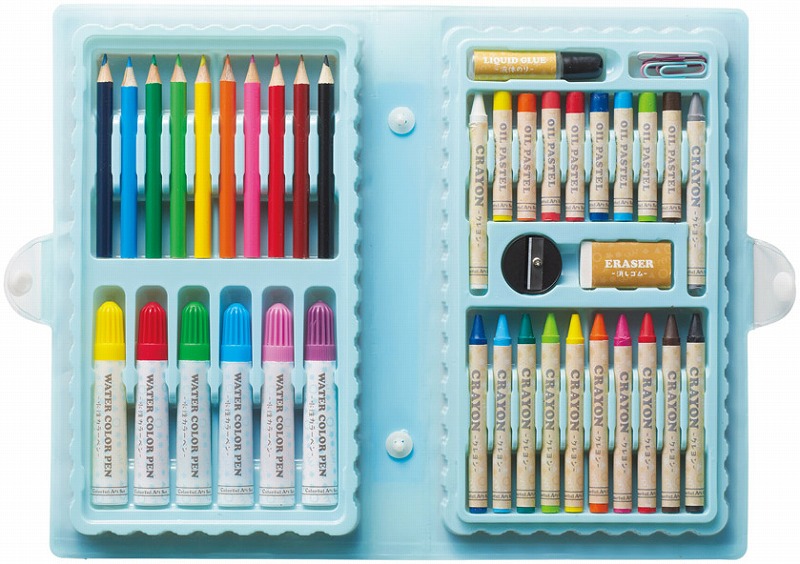 セット内容/色鉛筆10色・液体のり・鉛筆削り・クリップ4個・クレヨン12色・消しゴム・水性カラーペン6色・パステル8色