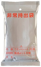 長期保存が可能なアルコールウェットティッシュ。 身体を清潔に保つのに必須のアイテムです。 パッケージは分かりやすい非常持出袋デザイン。