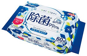 ボリュームたっぷりの除菌ウェット60米入り。 アルコールの力で99%除菌します。 ヒアルロン酸配合で肌にもやさしいタイプです。