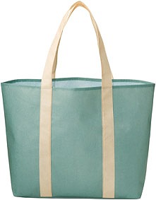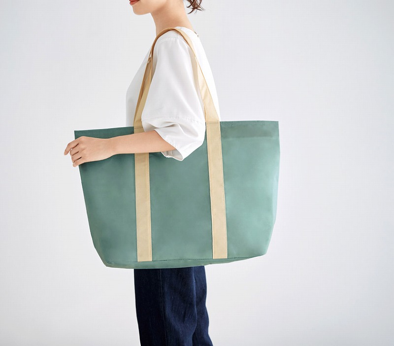 再生PET素材使用の厚手でしっかりしたバッグ。 小さくたたんで収納できるので便利。 環境に配慮したSDGs向きの商品です。