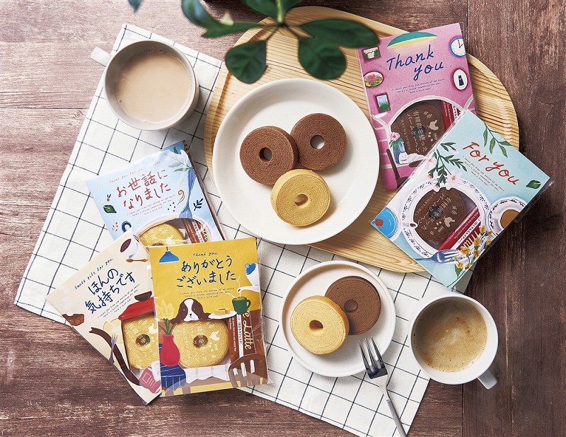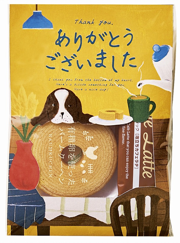 気持ちを伝えるメッセージにカフェタイムを添えて。ミニバウムクーヘンとスティックカフェラテ/ロイヤルミルクティーをギフトパッケージにセットしました。