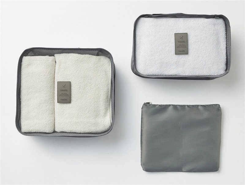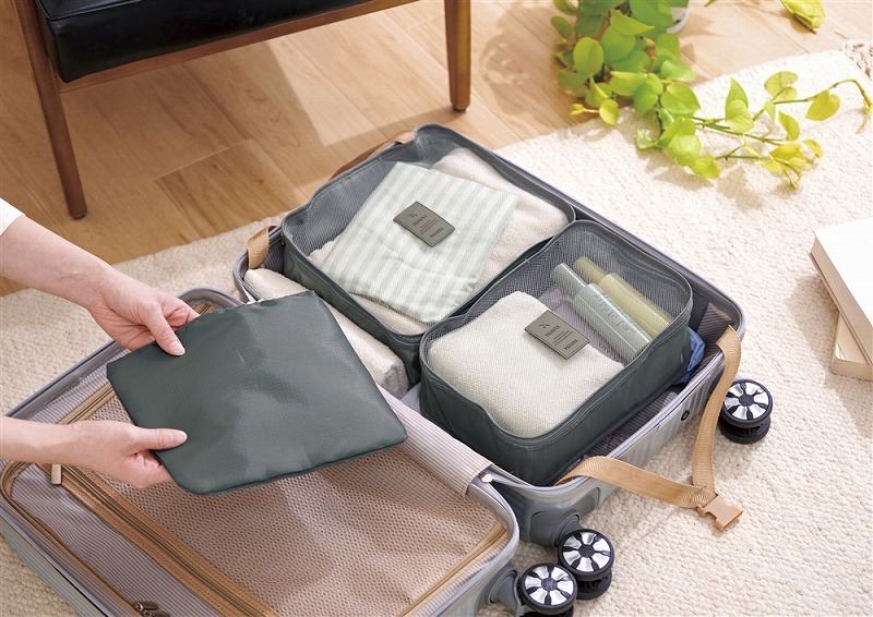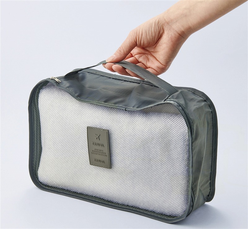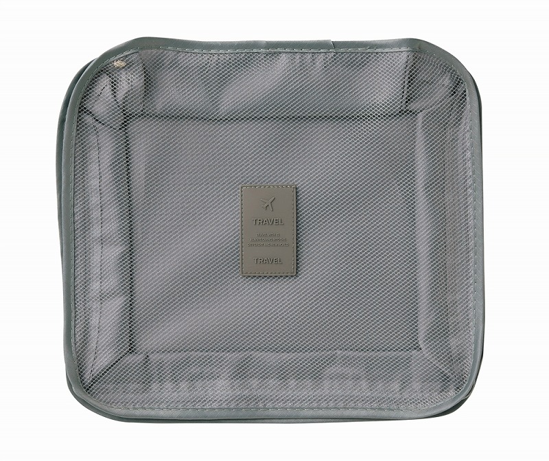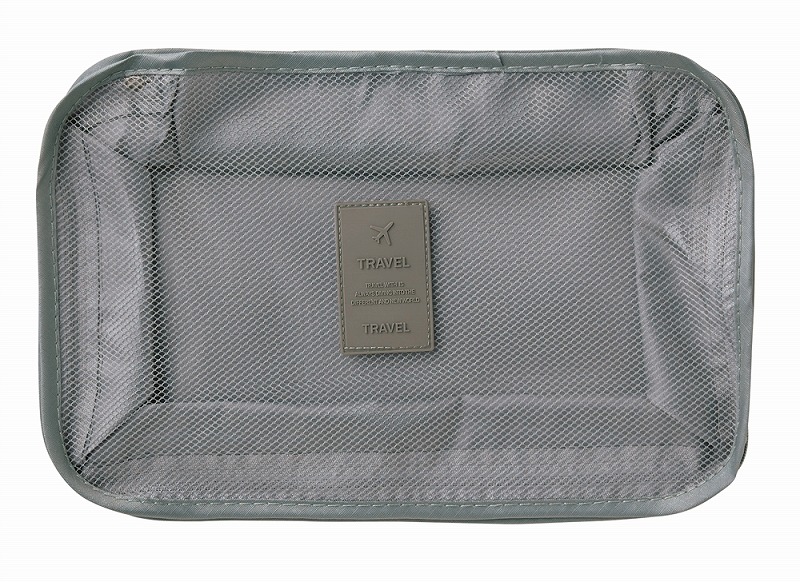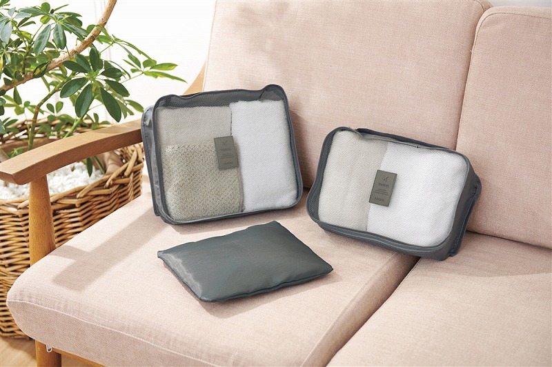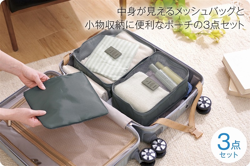 タグがおしゃれな中身が見えるメッシュバッグ2個と、小物収納に便利なフラットポーチの3点セット。メッシュバッグは着替え用の中サイズとタオル・アメニティ用の小サイズの2タイプ。A4より少し小さいポーチはスーツケースのポケットやスキマにも納めやすいフラットタイプです。