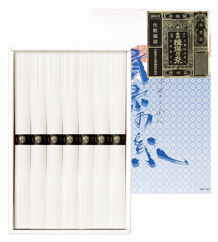 良質の小麦粉・播磨地方のおいしい水・赤穂の塩を使い、伝統の製法で作り上げた逸品です。さらに特級品(黒帯)は製造時期と製造者が限られ原材料もワンランク上で麺の細さも細くその食感はなめらかで上品な味わいです。