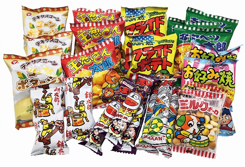 [セット内容] キャベツ太郎30個 玉葱さん太郎30個 フライドポテト30個 餅太郎30個 お好み焼30個 コーンポタージュ30個 うまい棒(2種)計60個 ミルクボーロ30個