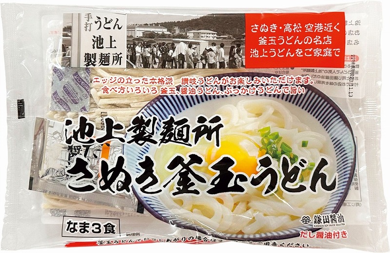 釜玉うどん用の老舗醤油蔵「鎌田醤油」のだし醤油付きです。人気店「池上製麺所」監修の釜玉うどん3食入りを2袋セットにしてお届けします。