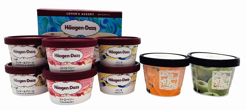 [セット内容] ハーゲンダッツラバースアソート(バニラ、ストロベリー、クッキー&クリーム)各70ml×各2、フルーツティアラソルベ(青リンゴ、ミカン)各108ml×各1