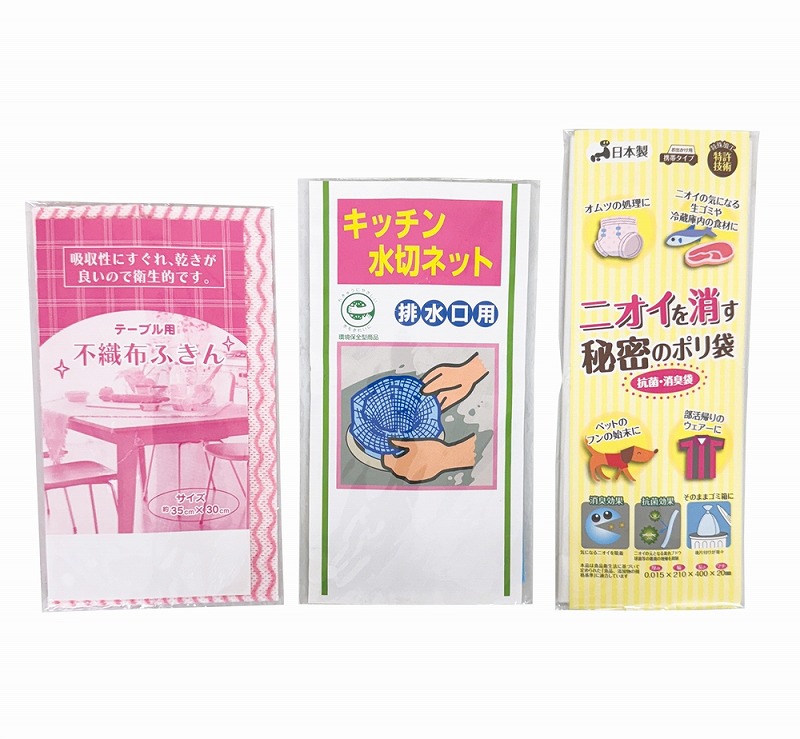 [セット内容] ・バイオグリーン持ち手つきポリ袋5枚×1 ・ストックバッグM7枚×1 ・ネピアティシュ120W×1 ・フリーザーバッグM5枚×1 ・調理ができるキッチンパックS70枚×1 ・エコキッチンペーパー10枚×1 ・ピカ王ミニ×1 ・ネットスポンジ×1 ・除菌ウェットティッシュ10枚×1 ・不織布ふきん1枚×1 ・ニオイを消す秘密のポリ袋2枚×1 ・キッチン水切ネット2枚×1 ※ネピアティシュ120Wは5色不均等アソートになります。 ※ネットスポンジは2色不均等アソートになります。