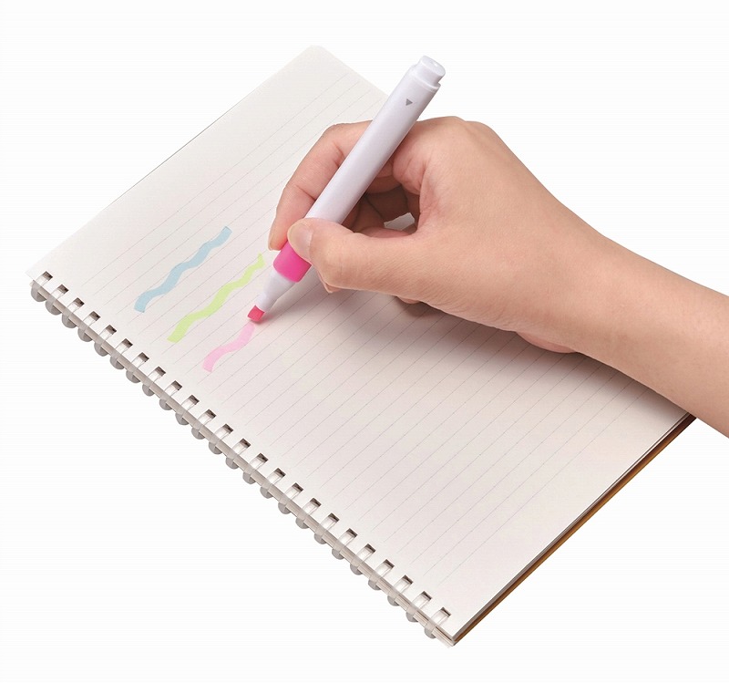 他のペンと並んでも目を引く、ユニークな形の蛍光ペン。ペン本体が白地なので、「映える」名入れでもっとユニークにしても楽しい商品です。 3色セットなのも嬉しいポイント。