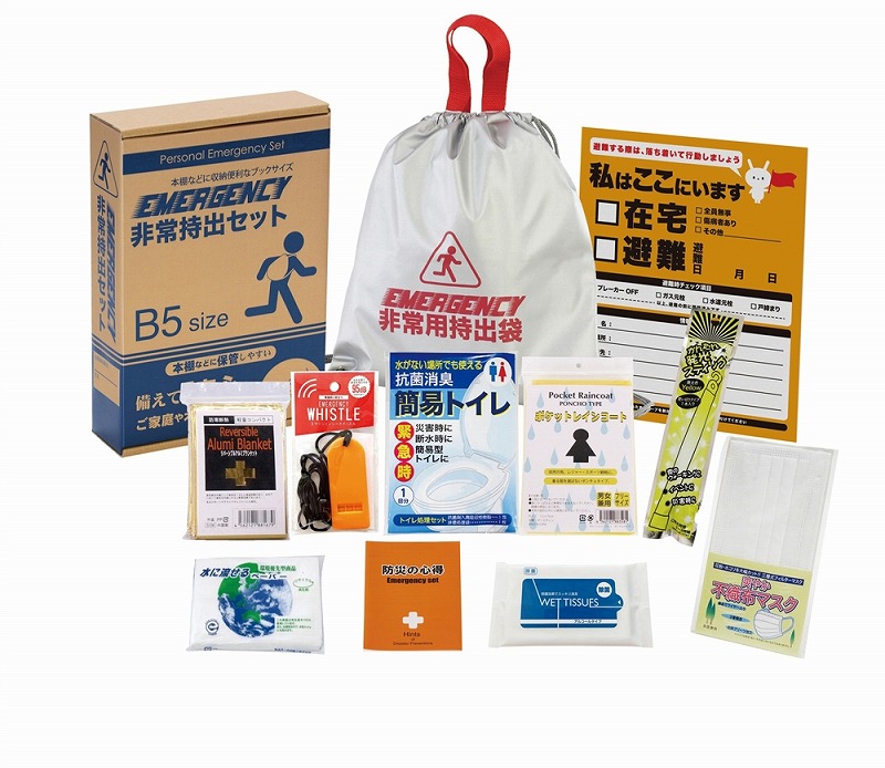 [セット内容] 非常用持出袋×1 防災の心得×1 ホイッスル×1 レインコート×1 抗菌消臭トイレ(凝固剤付き)×1 発光スティック×1 アルミブランケット(約140×220cm)×1 ウェットティッシュ(5枚)×1 緊急避難カード×1 水に流せるティッシュペーパー×1 マスク×1