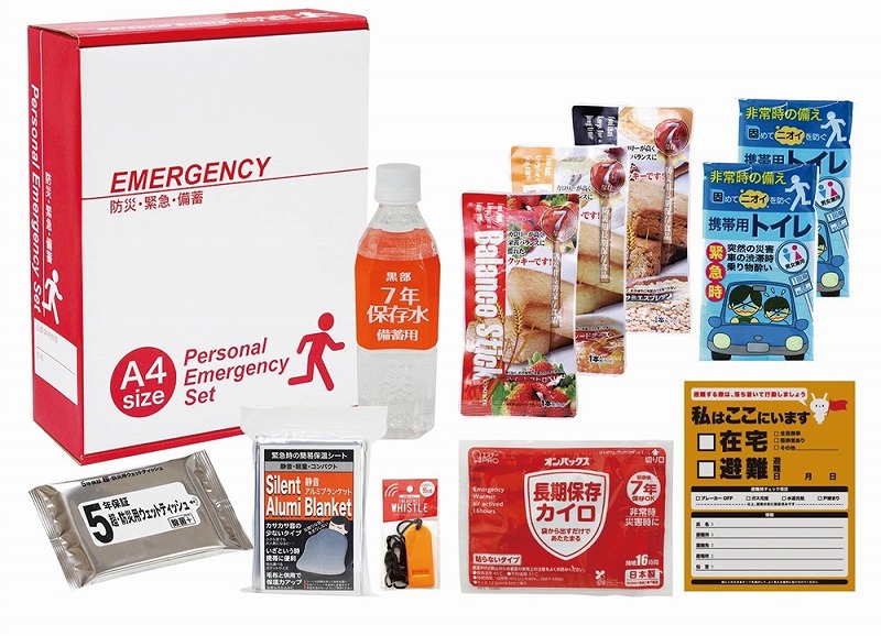[セット内容]・バランススティック×3・携帯用トイレ(凝固剤付き)×2・7年保存水(500ml)×1・静音アルミブランケット(約130×210cm)×1・カイロ×1・ホイッスル×1・ 緊急避難カード×1・ウェットティッシュ(20枚)×1