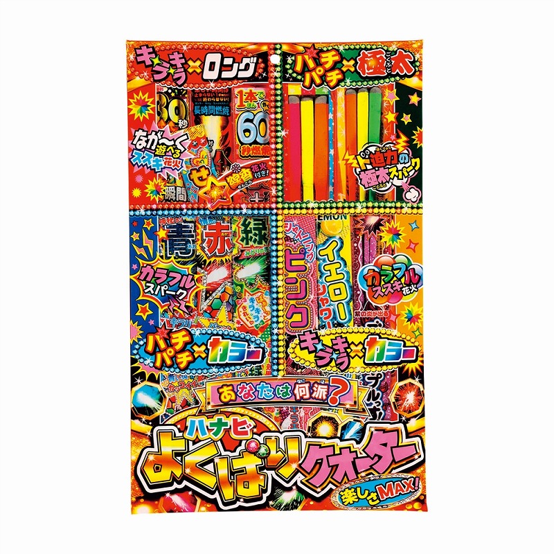 [キット内容] [特賞]スゴ盛り・・・1本 [1等]ハナビよくばりクォーター・・・2本 [2等]はなびーずM・・・2本 [3等]ハナビンジャー・・・10本 [4等]ミラクル5ススキ・・・15本 [付属品] 抽選くじ×30、抽選箱×1、くじ明細書×1、告知用A4カード×1 ※賞品の内容・仕様は画像と異なる場合があります。あらかじめご了承ください。
