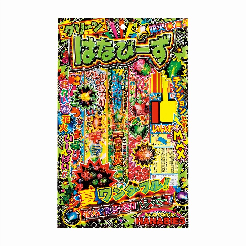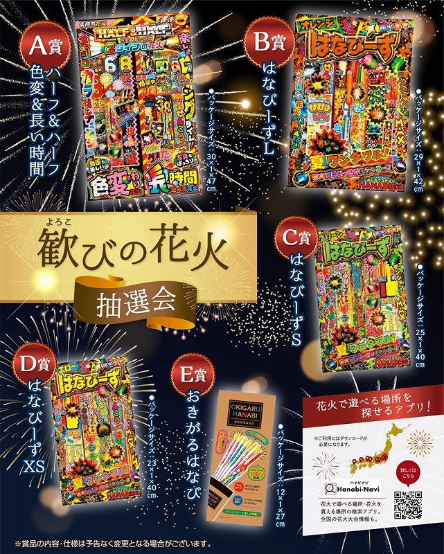 [キット内容] [A賞]ハーフ&ハーフ 色変&長い時間・・・5本 [B賞]はなびーずL・・・10本 [C賞]はなびーずS・・・20本 [D賞]はなびーずXS・・・25本 [E賞]おきがるはなび・・・40本 [付属品] 抽選くじ×100、抽選箱×1、くじ明細書×1、告知用A4カード×1 ※賞品の内容・仕様は画像と異なる場合があります。あらかじめご了承ください。
