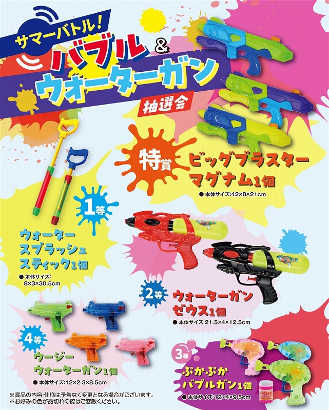 [キット内容] [特賞]ビッグブラスターマグナム・・・1本 [1等]ウォータースプラッシュスティック・・・3本 [2等]ウォーターガンゼウス・・・8本 [3等]ぷかぷかバブルガン・・・12本 [4等]ウージーウォーターガン・・・26本 [付属品] 抽選くじ×50、抽選箱×1、くじ明細書×1、告知用A3ポスター×1 ※賞品の内容・仕様は画像と異なる場合があります。あらかじめご了承ください。