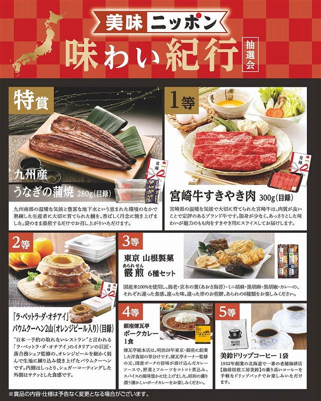 [キット内容] [特賞]九州産 うなぎの蒲焼280g(目録)・・・1本 [1等]宮崎牛 すきやき肉300g(目録)・・・1本 [2等]「ラ・ベットラ・ダ・オチアイ」バウムクーヘン2山(オレンジピール入り)(目録)・・・1本 [3等]東京 山根製菓 霰煎6種セット・・・2本 [4等]銀座煉瓦亭ポークカレー1食 ・・・5本 [5等]美鈴ドリップコーヒー1袋 ・・・40本 [付属] 抽選くじ×50、抽選箱×1、くじ明細書×1、告知用A4カード×1 ※賞品の内容・仕様は予告なく変更となる場合がございます。