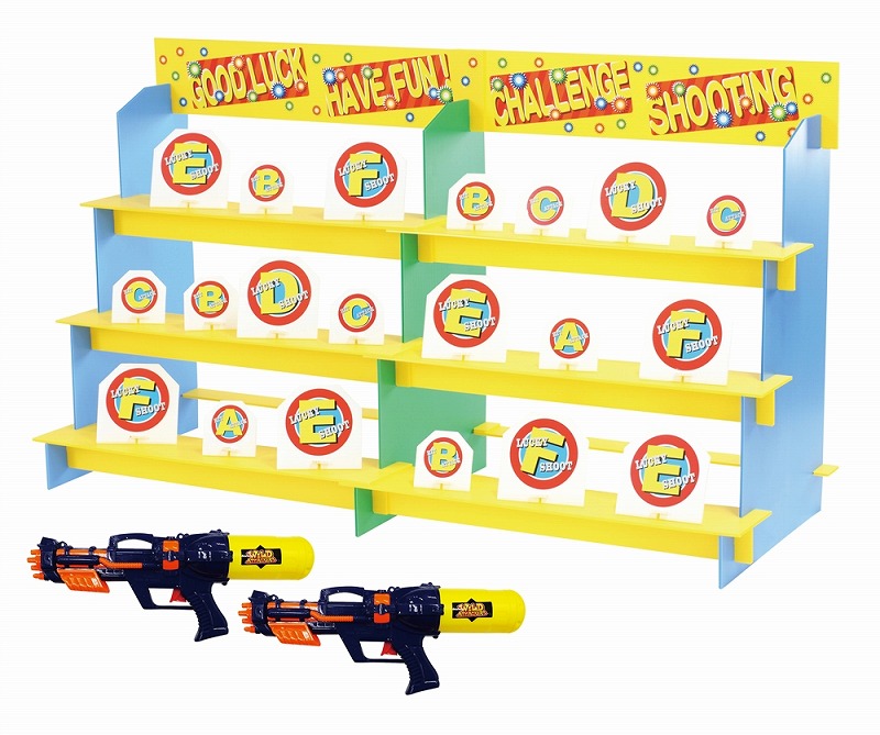 [セット内容] ディスプレイ台セット×1 的板(大)セット×10 ・的板(小)セット×10 A3的用シール×2・A4ディスプレイ用シール×2 水鉄砲×2