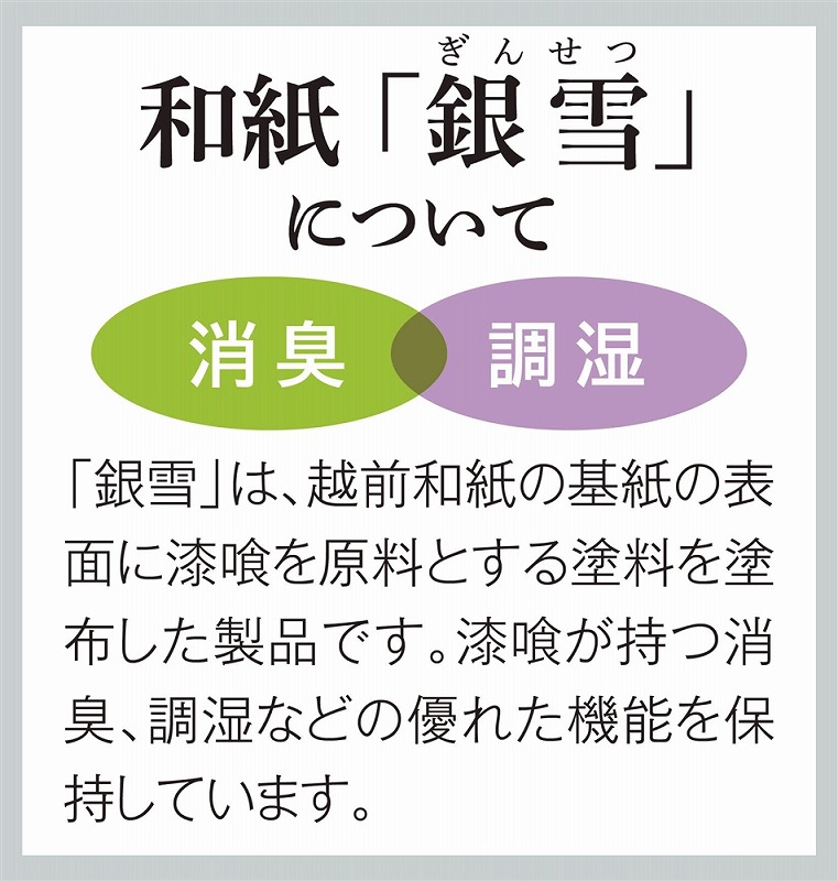 漆喰のチカラを発揮する高機能性和紙「銀雪」で消臭・調湿!「銀雪(ぎんせつ)」は、越前和紙の基礎の表面に漆喰を原料とする塗料を塗布した製品です。漆喰が持つ消臭・調湿などの優れた機能を保持しています。 「文様百趣」は古来から受け継がれてきた伝統文様の美しさとメッセージを未来へ伝えるデザインブランドです。 『梅文様』・・・学問の花と尊ばれる梅には、学業上達・合格祈願の祈りが込められています。