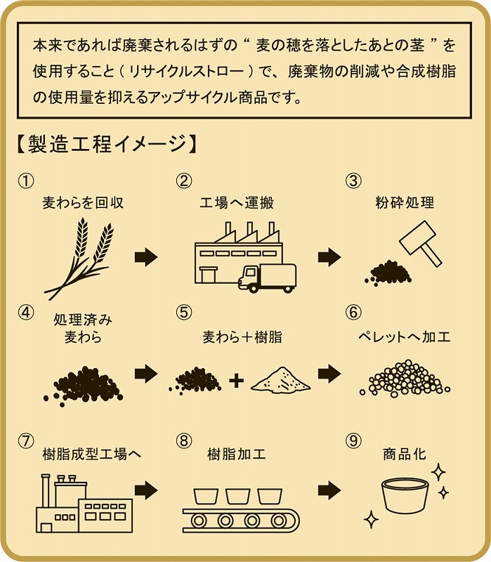 本来なら廃棄されてしまう「麦わら」をアップサイクル。「麦の穂を落とした後の茎」を再利用することで、廃棄物や合成樹脂の使用量を削減しています。軽くて割れないのでお子様がいても安心。サラダやシリアル、フルーツなど何にでも使える使い勝手の良さが魅力です。 ※天然素材配合のため、色に多少のばらつきが生じます。 ※電子レンジ・オーブン使用不可