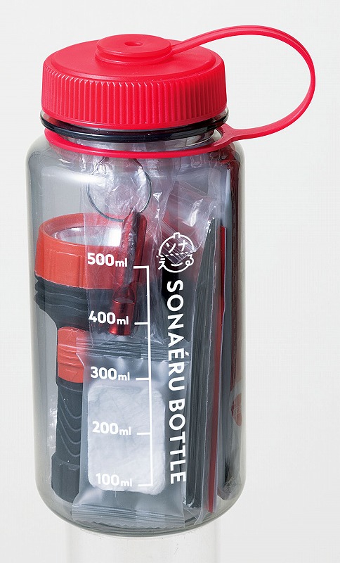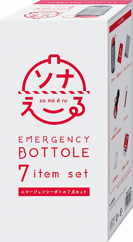 セット内容:ボトル、ライト、ホイッスル、アルミブランケット、携帯トイレ、圧縮タオル、防災のしおり