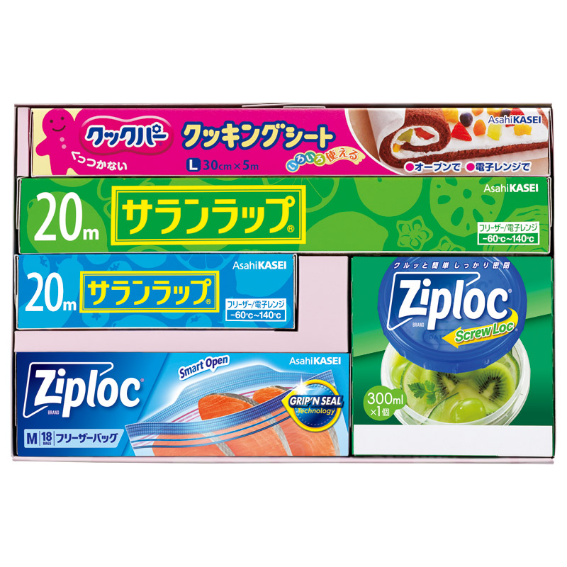 サランラップ(約30cm×20m)・サランラップ(約15cm×20m)・ジップロックフリーザーバッグM(18入)・ジップロックスクリューロック(300ml)・クックパークッキングシート(約30cm×5m)×各1