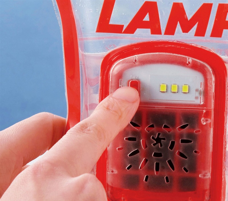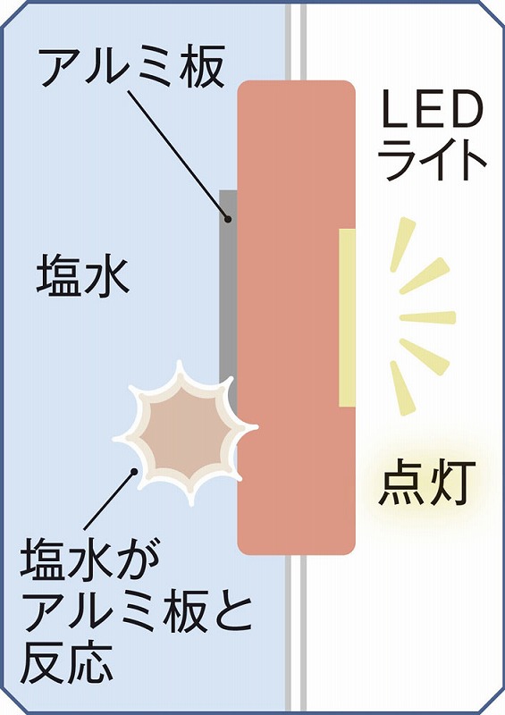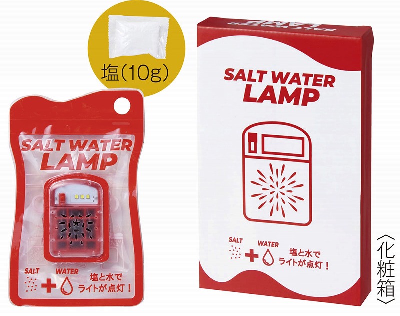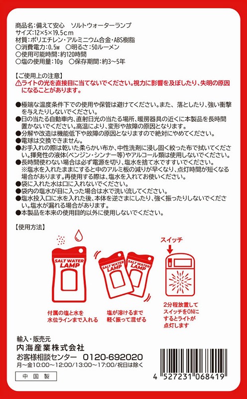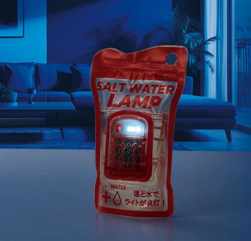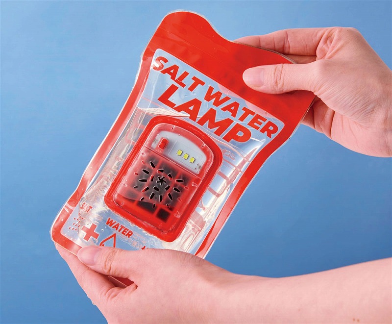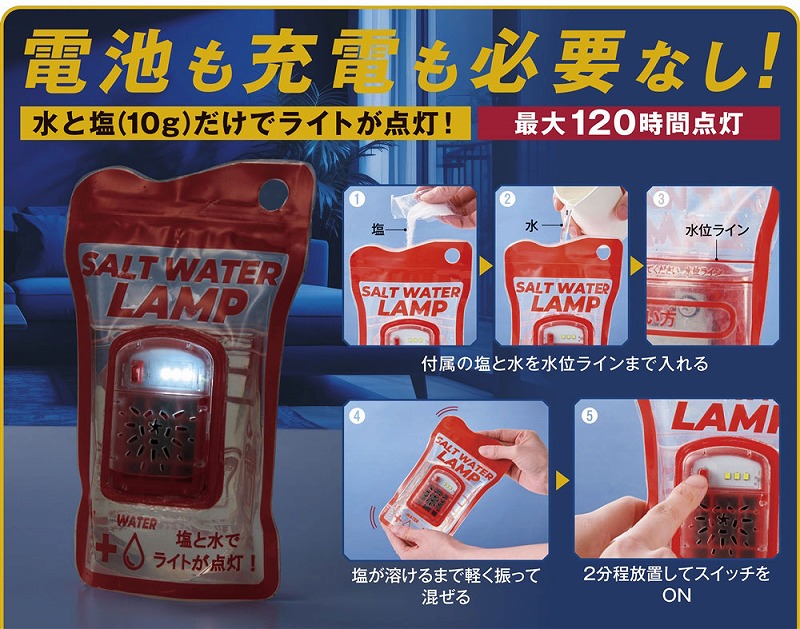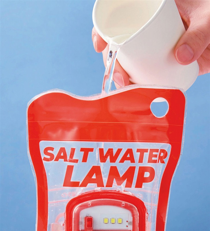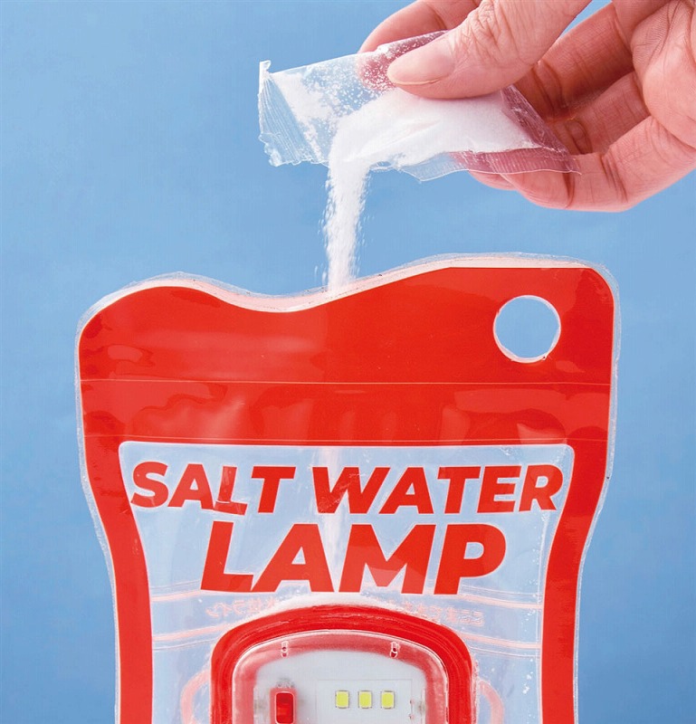 付属の塩を先に入れ、水位ラインまで水を注いだら軽く振って塩を溶かします。その後2分ほど放置してスイッチをON!塩水が袋内部のアルミ板と反応してLEDライトが点灯します。塩は付属のもの以外でもご使用いただけます。停電時や電池切れ、天候が悪くソーラー式が使えないシーンなどでもこれなら安心です。