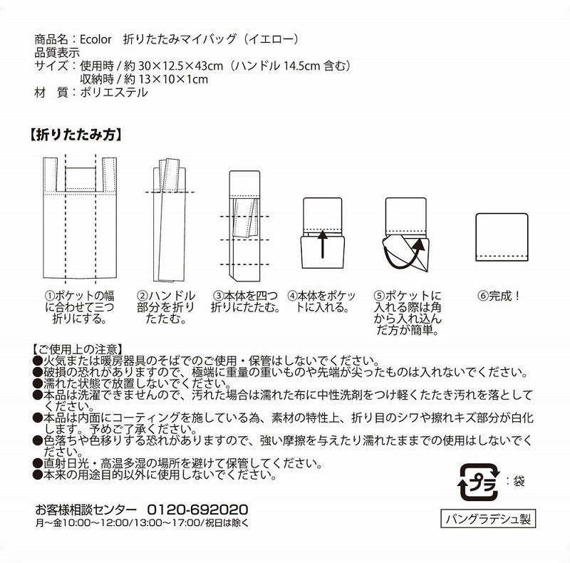 ちょっとしたお買い物に最適な携帯エコバッグです。折りたたみ式で内ポケットに収納でき、サイドマチがたっぷりあるので、大きな買い物も楽ーです。軽量でメール便にも対応しています。Ecolorシリーズは環境(Environment)に配慮する社会で活躍するエコバッグです。