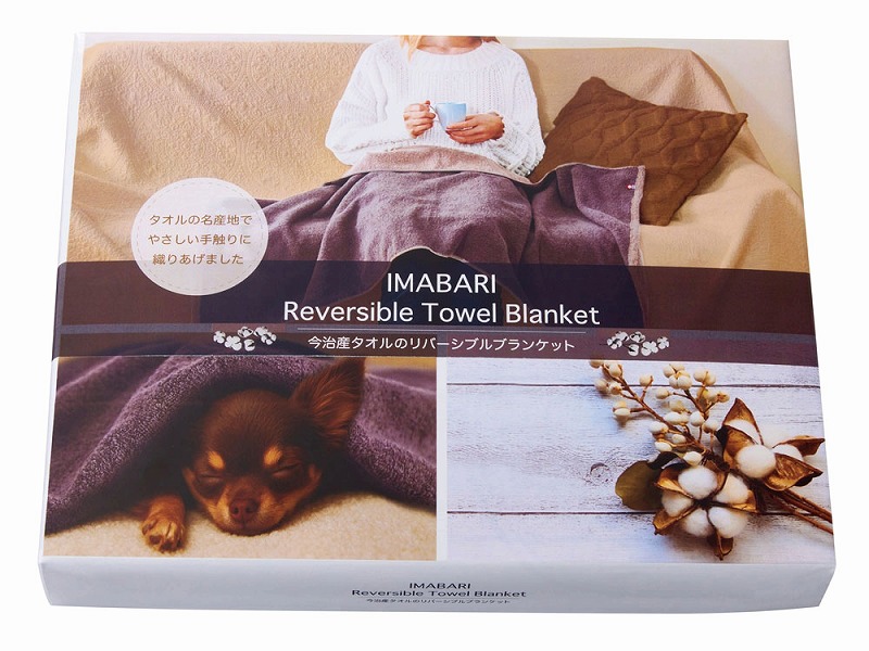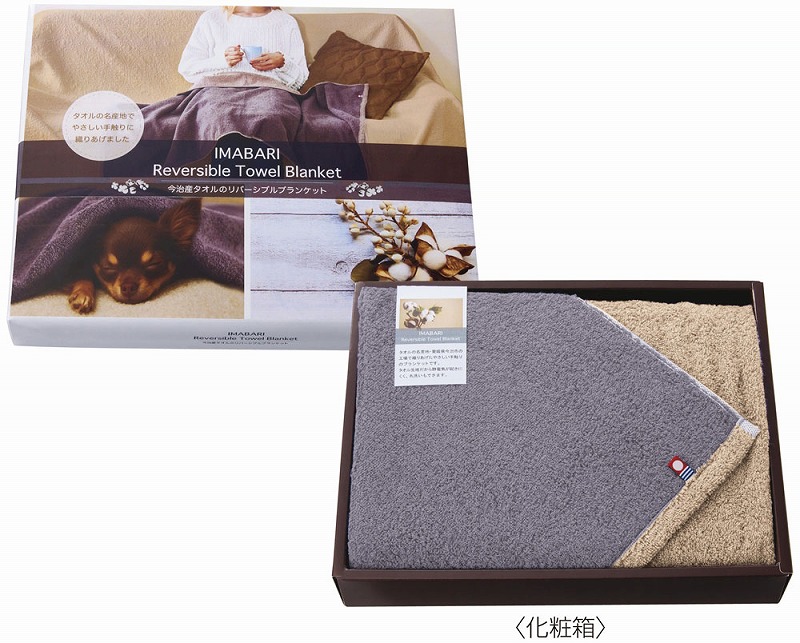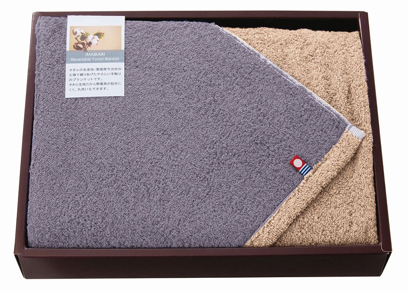 今治タオルならではのさらふわの手ざわりに、ニュアンスのあるグレーとベージュのリバーシブル仕様。お好きな色でリラックスタイムをお過ごしください。お子さまのお昼寝のタオルケットにも最適です。ギフト感の高い見蓋式化粧箱に納めてお届けします。