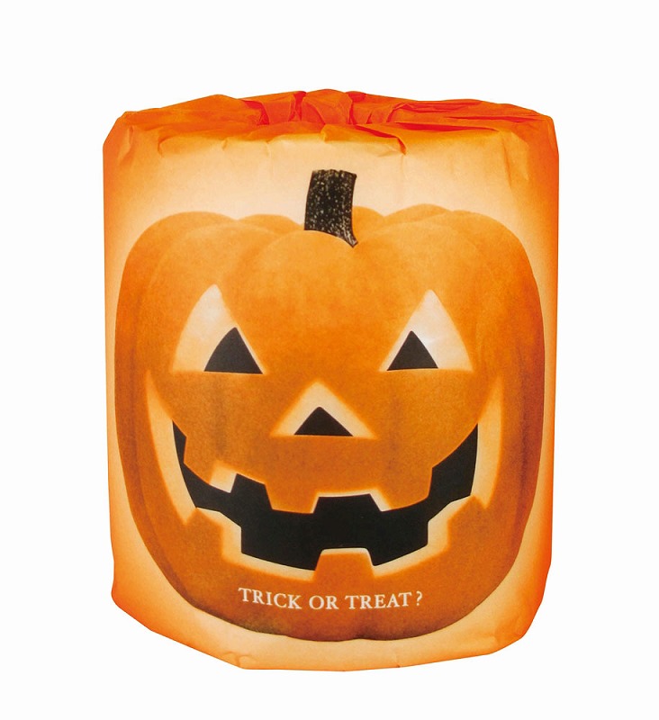 ハロウィンモチーフのトイレットペーパーです。中身は白無地のペーパーです。イベント会場で積み上げると、インパクトがあるディスプレイとして映え、ハロウィンの装飾として一役買います。ハロウィンイベント、秋のイベントでの、景品、来店者プレゼントなどの販促グッズとして最適です。