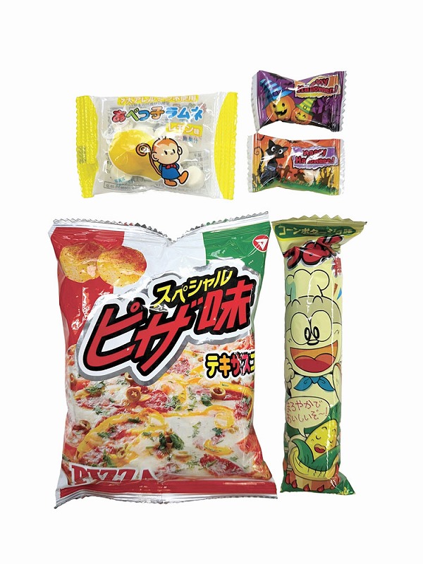 [セット内容] テキサスコーン スペシャルピザ味×1 うまい棒×1 あべっ子ラムネ×1 ハロウィンキャンディ×2
