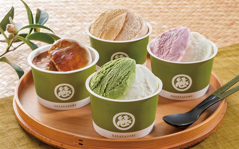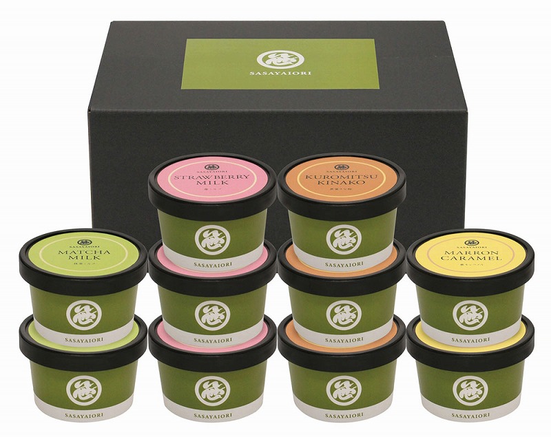 苺を楽しむ春、緑が濃くなり抹茶の爽やかさが嬉しい夏、秋の味覚の代表格の栗、厳しい冬の寒さの中での暖かさをイメージしたとろりとした黒蜜。春夏秋冬をイメージしてお召し上がりください。老舗和菓子店、「京菓匠 笹屋伊織」監修です。