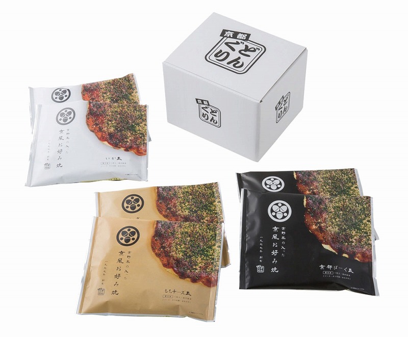 [セット内容] お好み焼(京都ぽーく玉・いか玉・もちチーズ玉)各200g×各2枚、ソースセット(濃厚ソース25g・かつお節粉末0.5g・あおさ0.2g)×各6