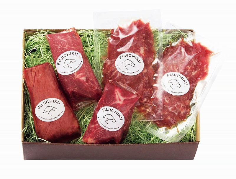 [セット内容] ふじ馬刺したたき80g×1、ふじ馬刺しロース80g×1、ふじ馬刺し上赤身80g×1、ふじ馬刺しユッケ50g×2、馬刺しのたれ5ml×4、おろししょうが3g×4、ユッケのたれ10g×2、たたきのたれ20g×1