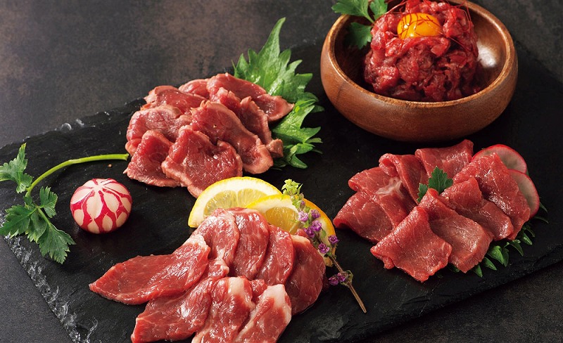 馬刺し用の馬肉を職人の手で丁寧にたたきに仕上げました。また上級赤身ロースは柔らかな食感、定番にして一番人気上赤身はモチっとしながら歯切れの良い食感と赤身の旨みが特徴です。さらに今では貴重となったユッケは自社独自の配合で、丁寧に細切りに仕上げました。