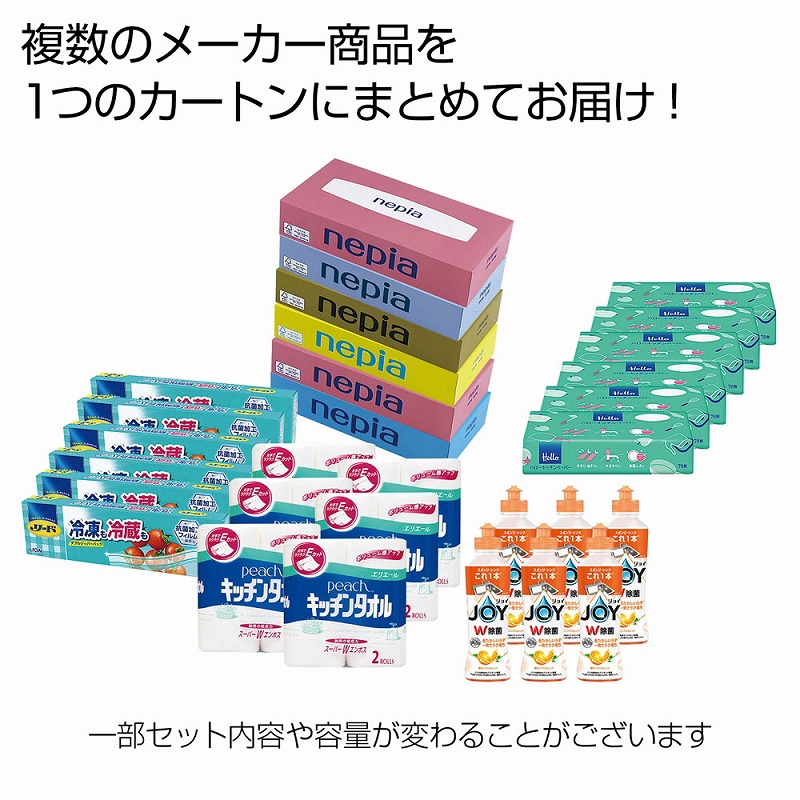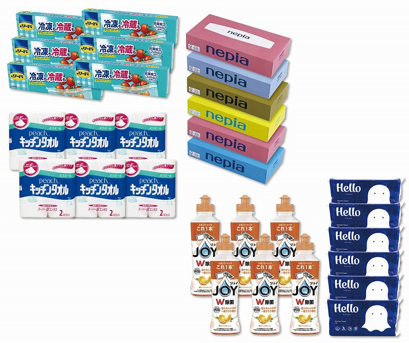[セット内容] ・P&G除菌ジョイコンパクト170ml(シトラスオレンジ)×6 ・ライオンリード冷凍も冷蔵も新鮮保存バッグS3枚×6 ・エリエールピーチキッチンタオル2ロール(50カット)×6 ・ネピアボックスティシュ150W×6 ・ハローキッチンペーパー70枚×6 ※ネピアボックスティシュ150Wは5色不均等アソートになります。