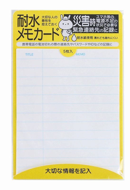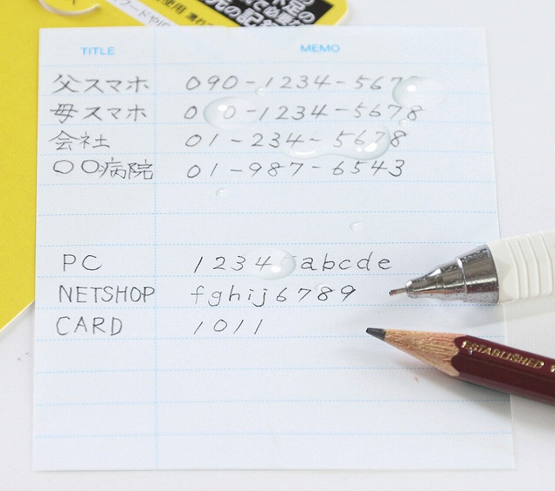 耐水紙を使ったメモセット。 携帯電話の電池切れや故障の際における連絡先の記録に。パスワードやID・暗証番号などの記録に。迷子対策として連絡先の表示に。災害時の伝言メモに。