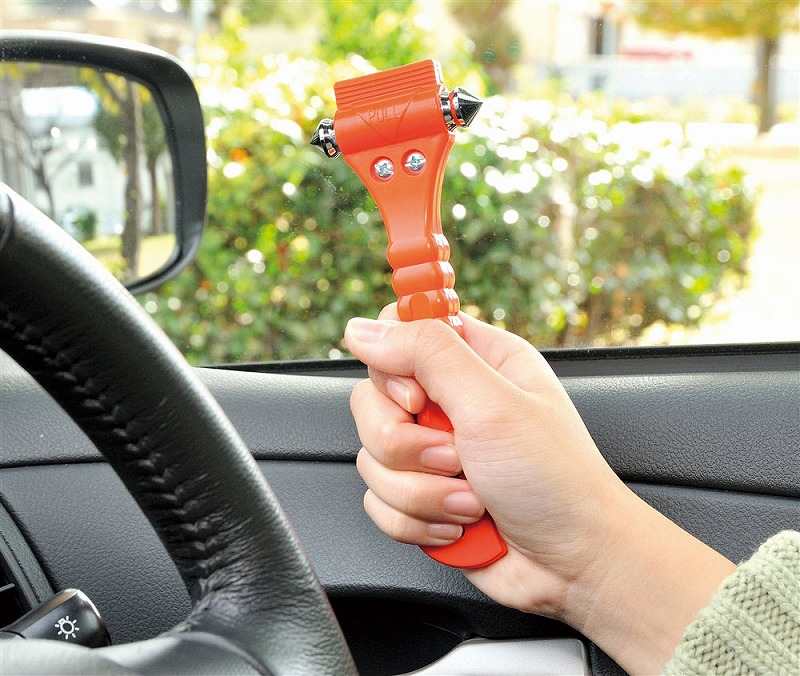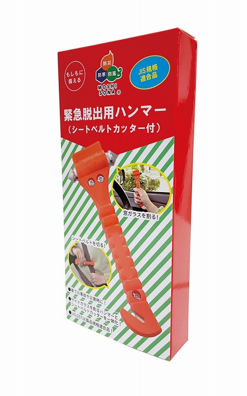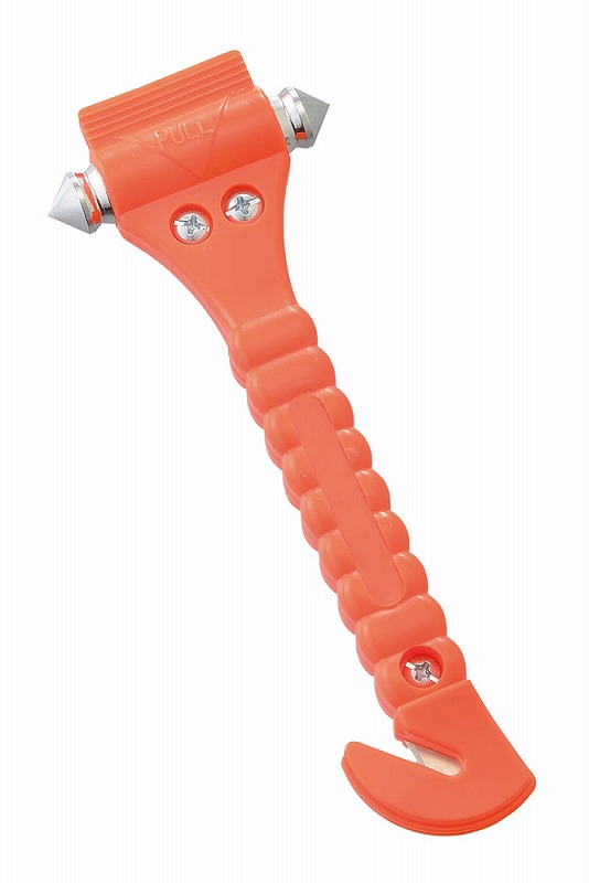 災害時や緊急時に自動車のガラスを破壊し脱出するハンマーです。シートベルトカッターも付いていて、ベルトロック時に使用できます。JISーD5716製品規格適合品