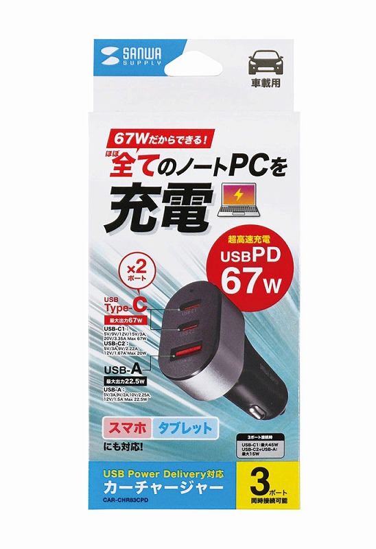スマホ、タブレットを急速充電でき、最大67Wの出力でノートPCの充電もできる車載充電器