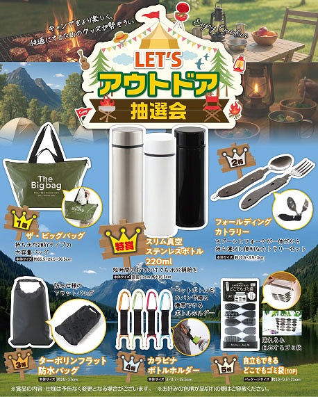 [キット内容] [特賞]スリム真空ステンレスボトル220ml・・・1本 [1等]ザ・ビッグバッグ・・・2本 [2等]フォールディングカトラリー・・・3本 [3等]ターポリンフラット防水バッグ・・・4本 [4等]カラビナボトルホルダー・・・5本 [5等]自立もできるどこでもゴミ袋(10P)・・・15本 [付属品] 抽選くじ×30、抽選箱×1、くじ明細書×1、告知用A3ポスター×1 ※賞品の内容・仕様は画像と異なる場合があります。あらかじめご了承ください。