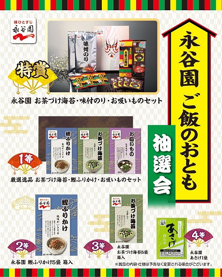 [キット内容] [特賞]永谷園 お茶づけ海苔・味付のりお吸いものセット・・・1本 [1等]厳選逸品 お茶づけ海苔・鰹ふりかけ・お吸いものセット・・・1本 [2等]永谷園 鰹ふりかけ5袋 箱入・・・2本 [3等]永谷園 お茶づけ海苔5袋 箱入・・・2本 [4等]永谷園 あさげ1袋・・・24本 [付属品] 抽選くじ×30、抽選箱×1、くじ明細書×1、告知用A4カード×1 ※賞品の内容・仕様は画像と異なる場合があります。あらかじめご了承ください。