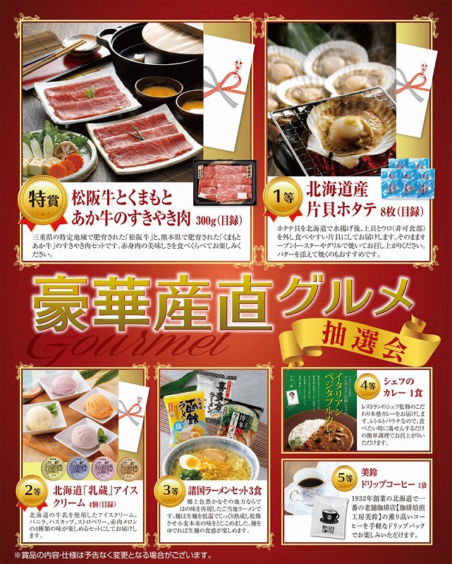 [キット内容] [特賞]松坂牛とくまもとあか牛のすき焼き肉300g(目録)・・・1本 [1等]北海道産 片貝ホタテ8枚(目録)・・・1本 [2等]北海道 乳蔵アイスクリーム4個(目録)・・・1本 [3等]諸国ラーメンセット3食・・・2本 [4等]シェフのカレー1食・・・5本 [5等]美鈴ドリップコーヒー1袋・・・40本 [付属品] 抽選くじ×50、抽選箱×1、くじ明細書×1、告知用A4カード×1 ※目録には、下記付属品がございます。 ・A4判POP1枚(スタンド式セルケース入) ・目録封筒1部 ・商品交換用ハガキ1枚(有効期間:納品後約180日間) ・個人情報保護シール1枚 ※賞品の内容・仕様は予告なく変更となる場合がございます。