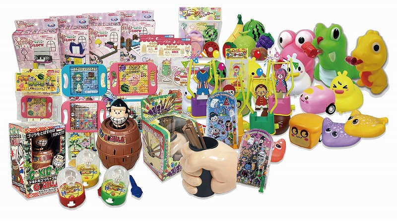 いろいろなおもちゃが100個セットになっています。このキットのみでバラマキ景品としてもご活用いただけます。