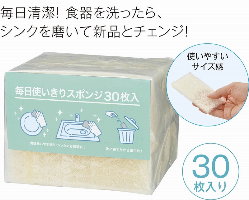菌の発生しやすいスポンジは使い捨てが最も衛生的。程よい厚みの使いやすい使い切り型スポンジです。30枚も入っているのでコスパ抜群!食器を洗って1日の終わりにはガス台やシンク・排水口などもお掃除!次の日には新しいスポンジで気持ちよくスタートできます。忙しい毎日の家事を少しでもラクに乗り切りましょう!