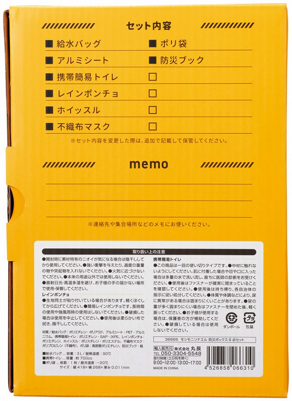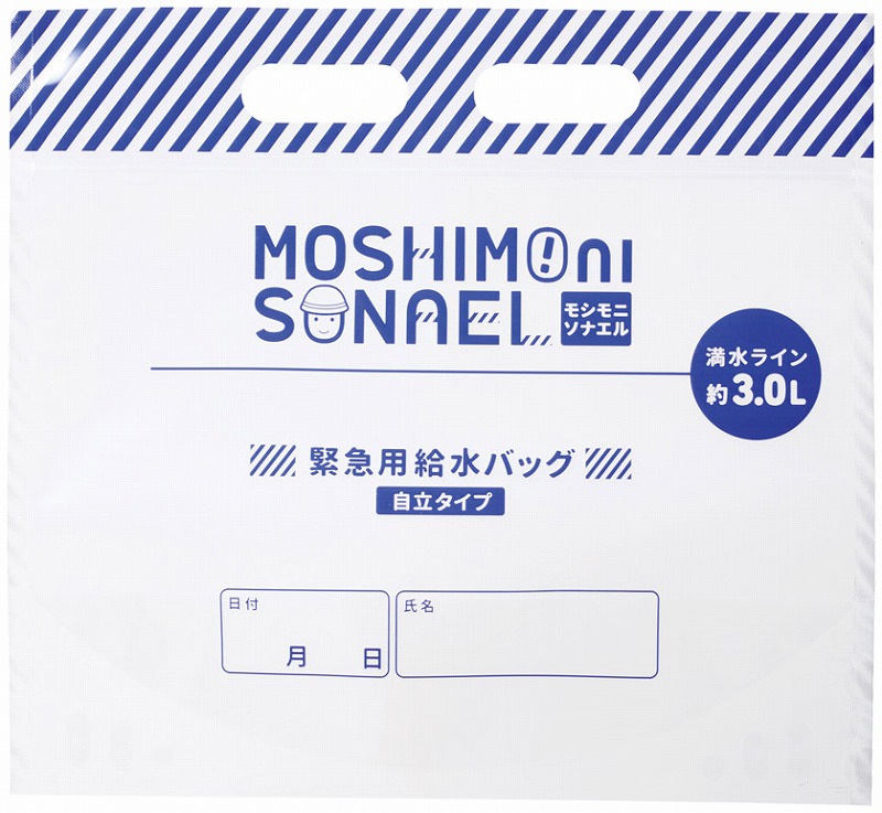 セット内容/給水バッグ3L・レインポンチョ・アルミシート(1400×700mm)・携帯簡易トイレ・ポリ袋×1・ホイッスル・不織布マスク・防災ブック