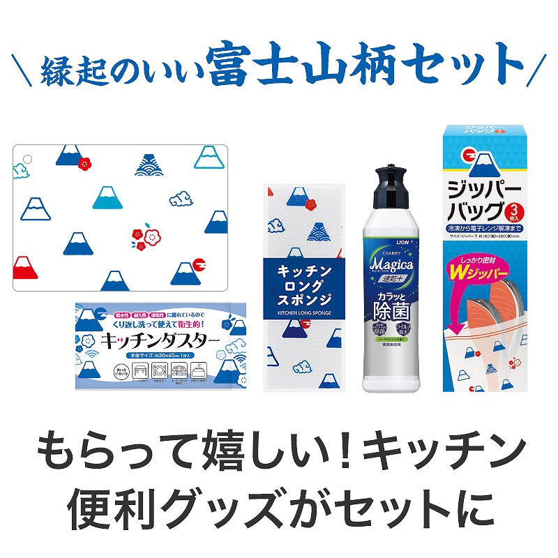 ライオン CHARMY Magica(速乾+カラッと除菌 シトラスミントの香り) 220ml・キッチンロングスポンジ・ミニまな板シート・ジッパーバッグ(3枚入)・キッチンダスター(1枚入) 各1