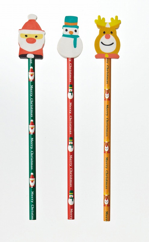 クリスマス鉛筆にサンタやトナカイ、スノーマンの消しゴムが付いています。