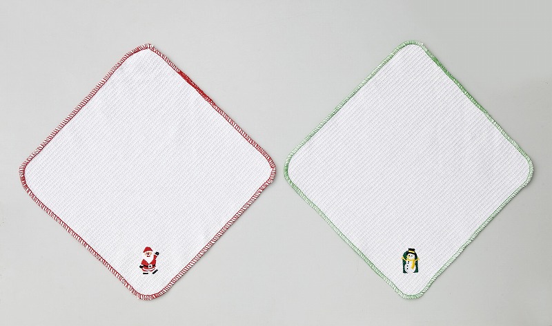 サンタとスノーマンのワンポイントの刺しゅうが可愛いキッチンクロスの2枚セットです。