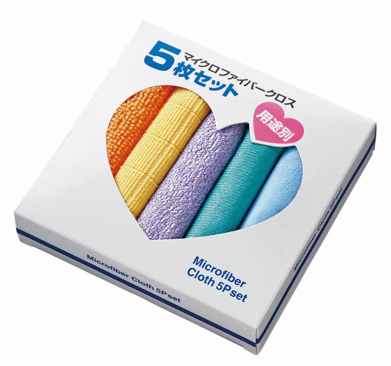 用途別に使用できるマイクロファイバークロス5枚がおしゃれなパッケージにセットされています。
