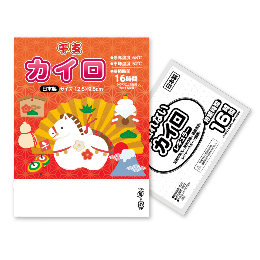 干支柄パッケージ入りの使い捨てカイロレギュラーサイズです。安心のアイリス製(日本製)。