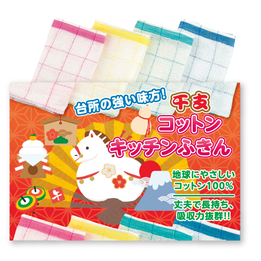 コットン100%で、丈夫で長持ちな吸収力抜群のふきんです。赤、緑、黄、桃の4色からアソートです。