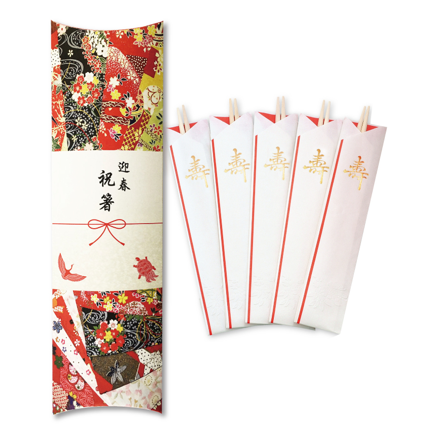 金箔の「寿」が美しい祝箸5膳を華やかなピローボックスに入れたちょっと豪華な祝箸です。