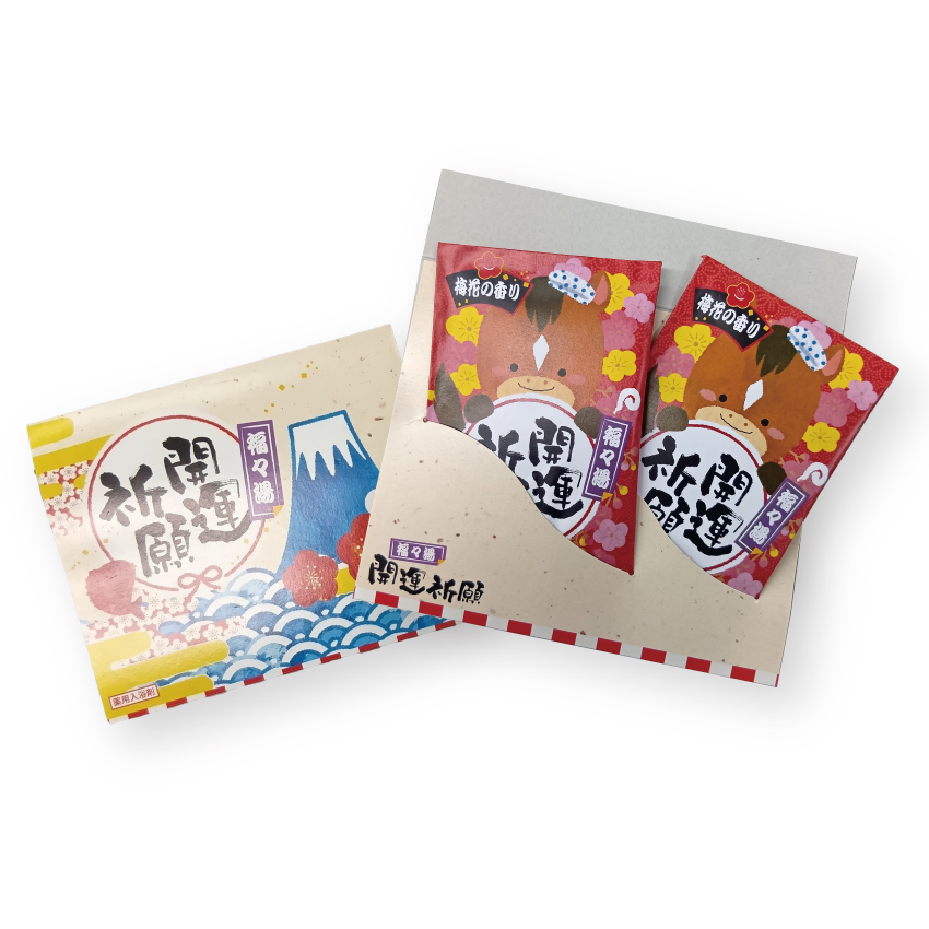 干支(寅)柄パッケージの入浴剤2包入り。梅花の香り。タトウ式ケース入り